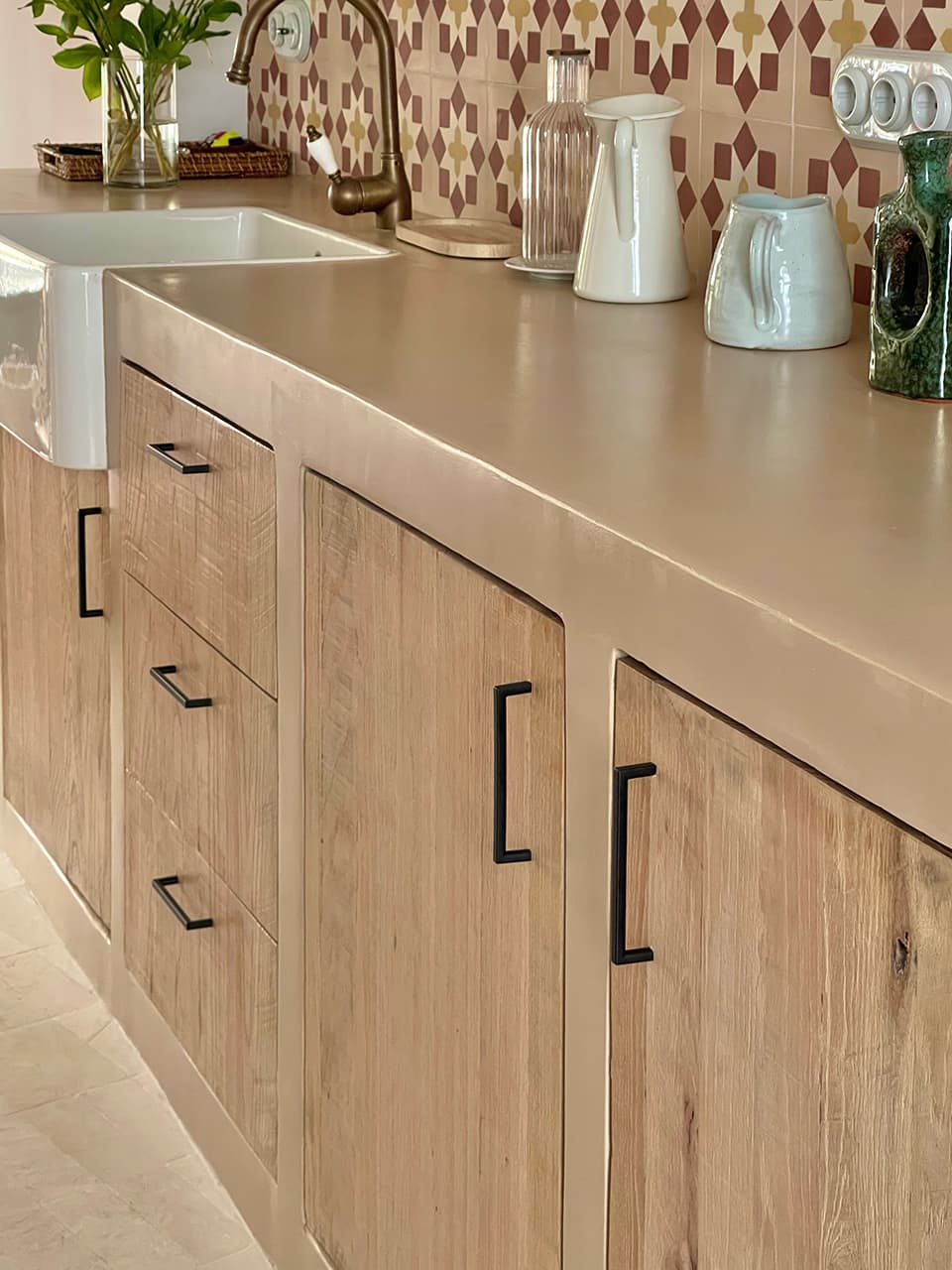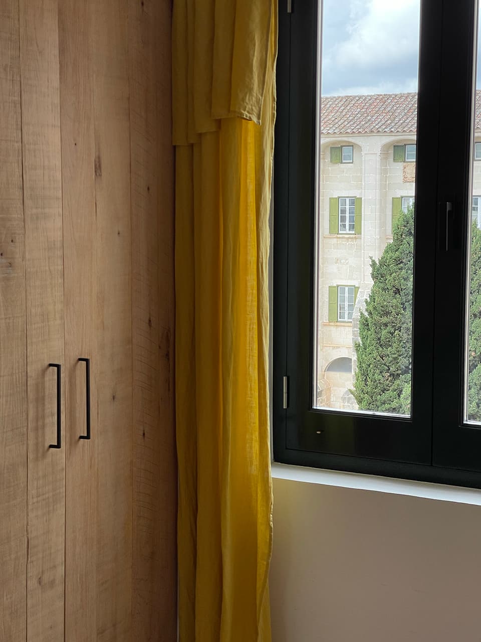 Nuestra aportación introduce el roble rojo como material central del interior. Diseñamos y fabricamos mobiliario a medida, con piezas propias y otras desarrolladas junto a Atalier du Pont, integradas en la arquitectura.