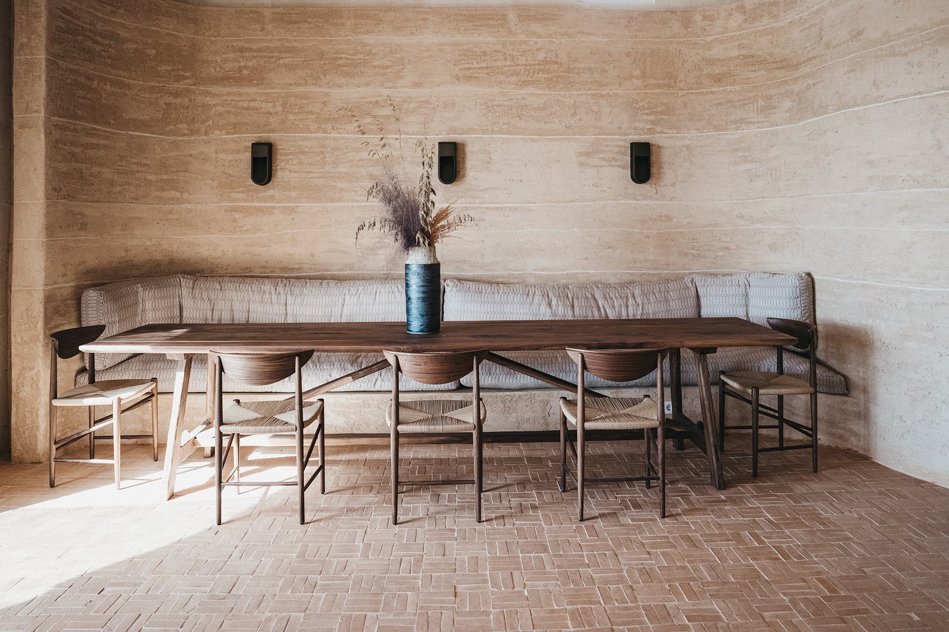 Mesa de payés en nogal europeo, diseñada y fabricada por Gavila. Tres metros y medio de longitud con una estructura preparada para soportar peso y uso continuado. Se realiza a medida en dimensiones y acabado según el espacio.